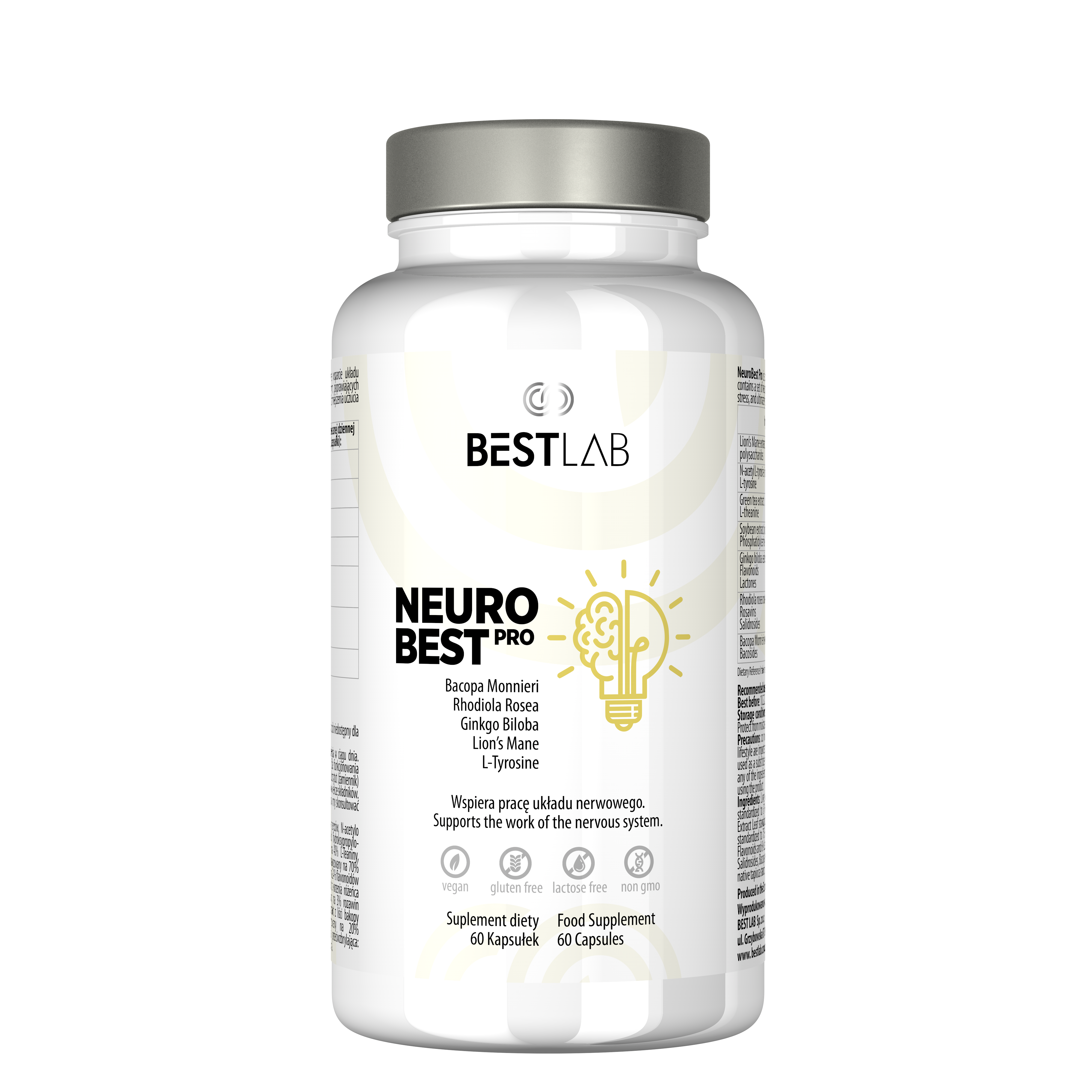 NeuroBest PRO ist ein Nahrungsergänzungsmittel, das sieben Inhaltsstoffe kombiniert, die die Gesundheit des Gehirns unterstützen: Extrakt aus Löwenmähne, Rosenwurz-Extrakt, Ginkgo-Biloba-Extrakt, L-Theanin aus grünem Tee, Bacopa monnieri-Extrakt sowie Tyrosin und Phosphatidylserin. Neuro Best PRO ist ein Präparat mit einer einzigartigen Kombination biologisch aktiver Substanzen. Die Kombination natürlicher, zertifizierter Pflanzenextrakte mit hohen Standardisierungsgraden garantiert Wirksamkeit.
