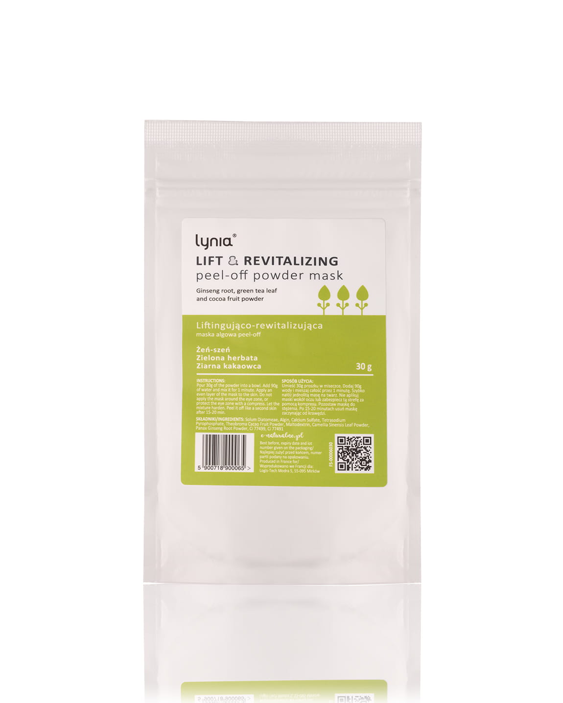 Opis działania kosmetyku Liftingująco-rewitalizująca maska algowa peel-off z żeń-szeniem, zieloną herbatą oraz ziarnami kakaowca  to profesjonalna maska algowa, która po zmieszaniu z wodą daje gęstą masę gotową do użycia. Posiada silne działanie odmładzające i rewitalizujące. Doskonale oczyszcza cerę, nawilża ją i odżywia. Idealna w pielęgnacji skóry zwiotczałej, starzejącej się i/lub wrażliwej, wymagającej intensywnej stymulacji i głębokiego nawilżenia