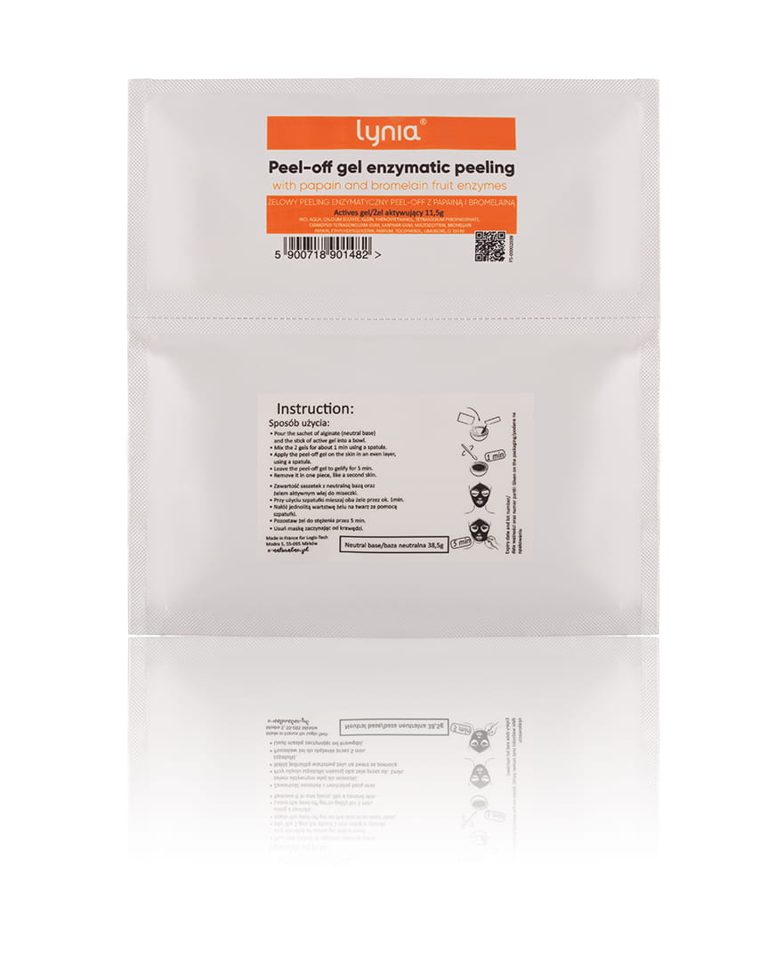 The peel-off, gel, enzymatic peeling from tropical fruit has highly concentrated active ingredients, thanks to which the treatment time is extremely short, but very effective. The peeling activates and normalizes skin exfoliation and removes dead epidermal cells. Thanks to the content of bromelain and papain and enzymes of plant origin from pineapple and papaya, the peeling performs superficial and extremely gentle exfoliation of the upper layer of the epidermis. After the treatment, the skin becomes cleansed, soft to the touch, calmed and intensely moisturized.